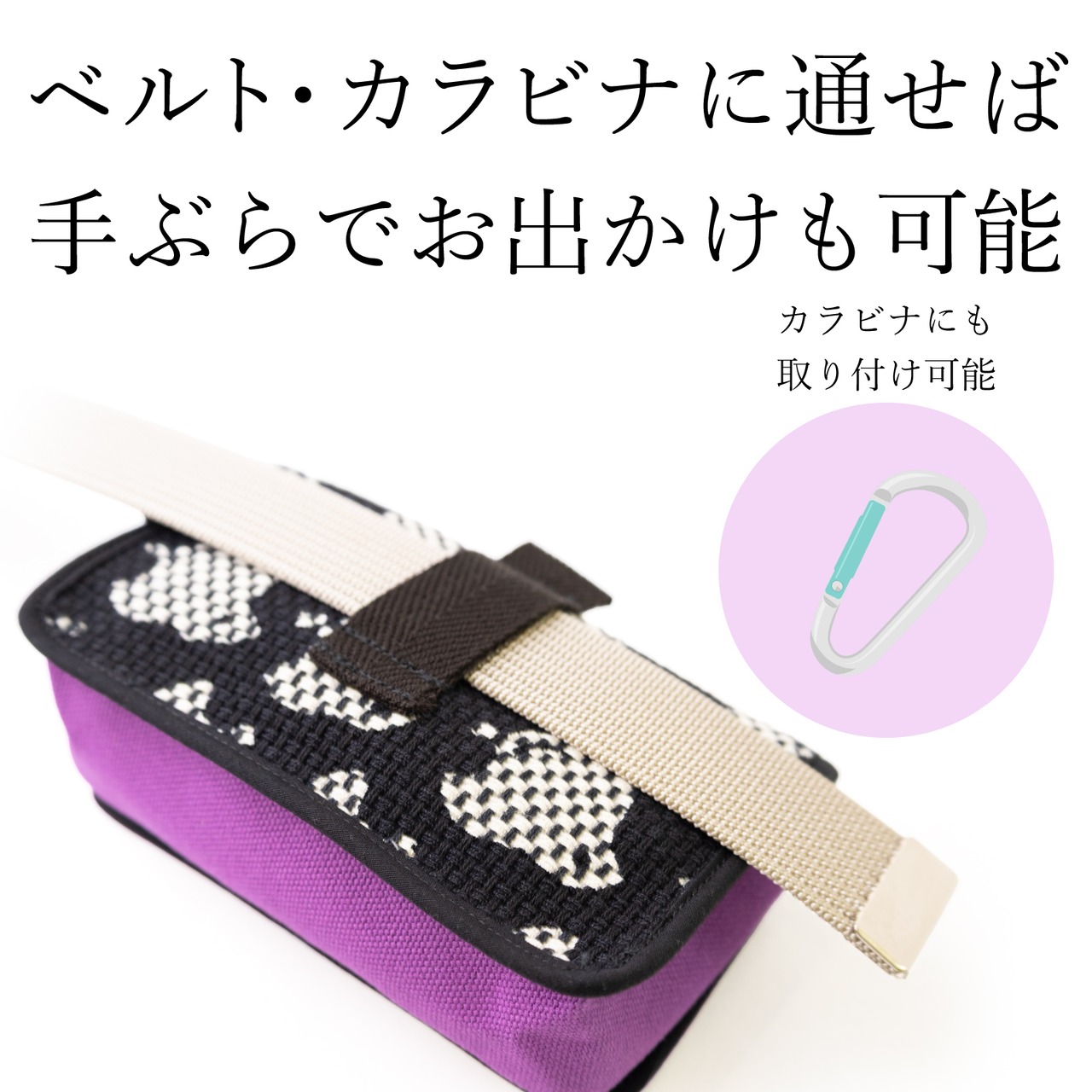 ベルトに通して使うのはもちろん、カラビナを取り付けて即座に脱着できます。