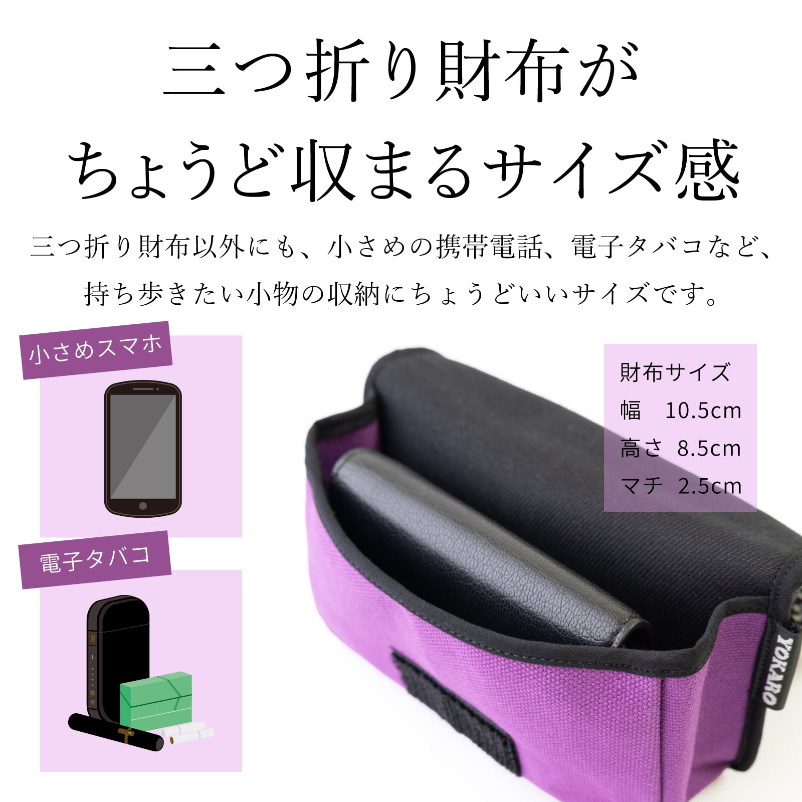 携帯電話や電子タバコなど、すぐに取り出したい小物をスマートに収納できます。