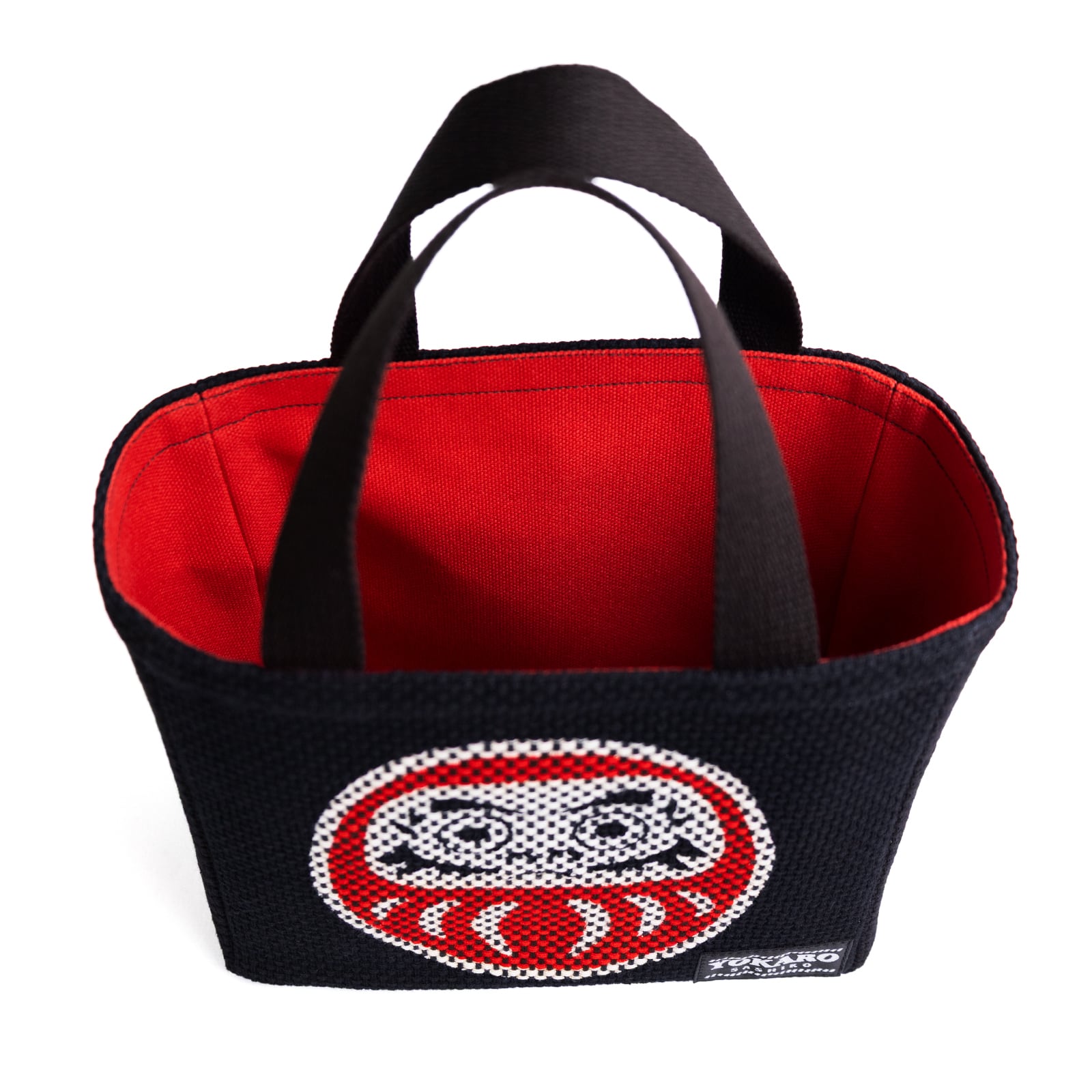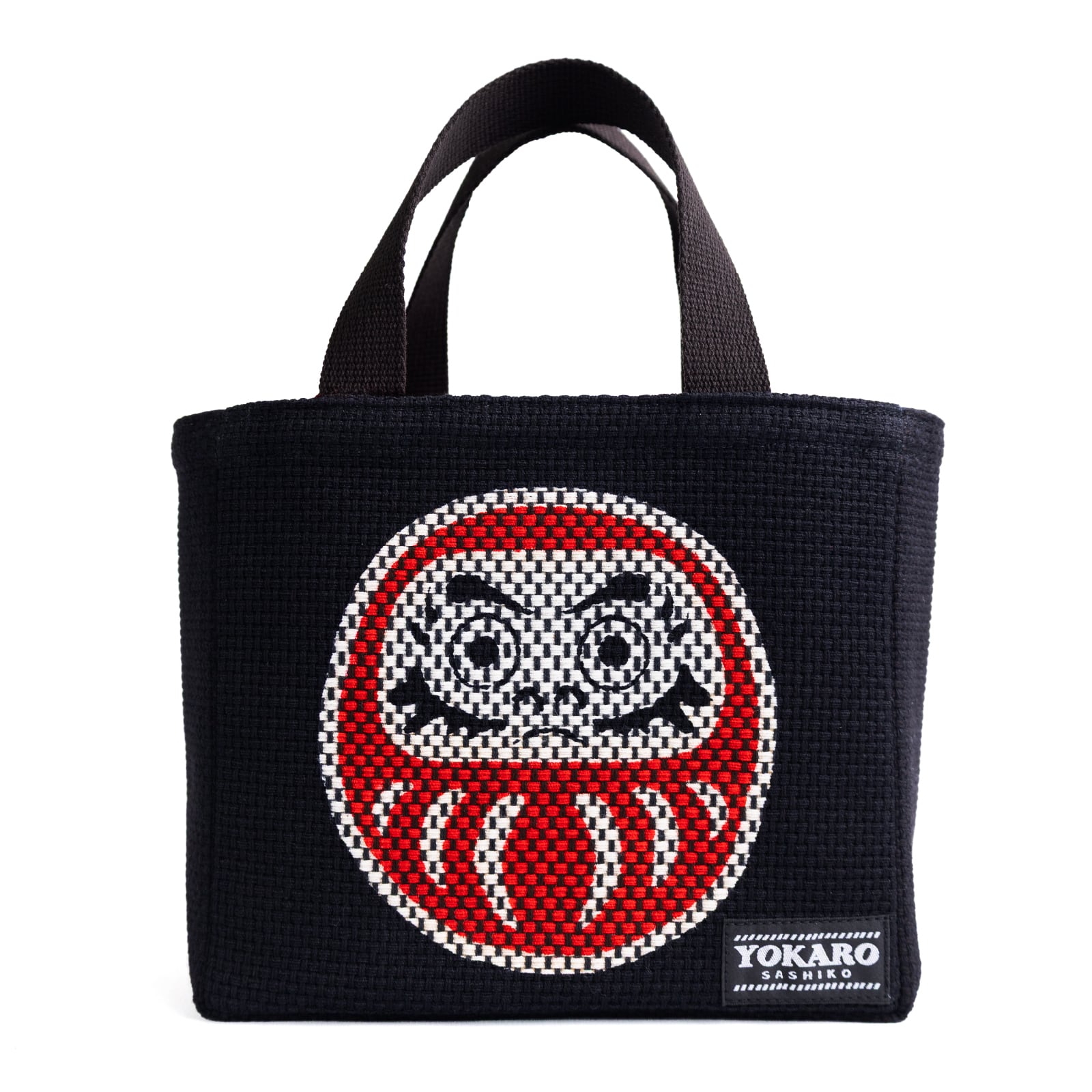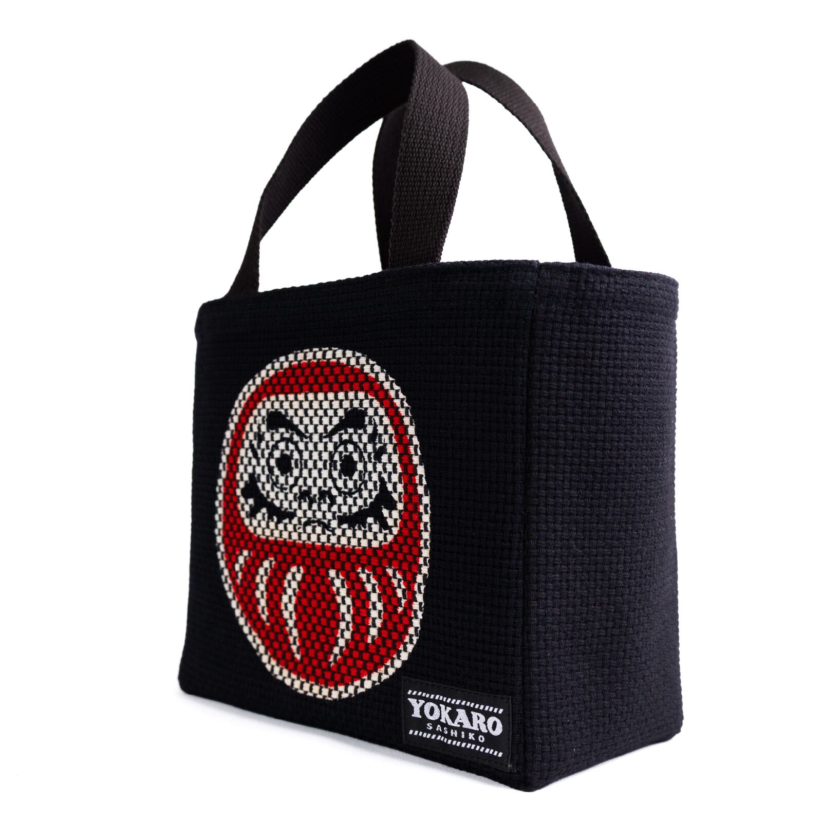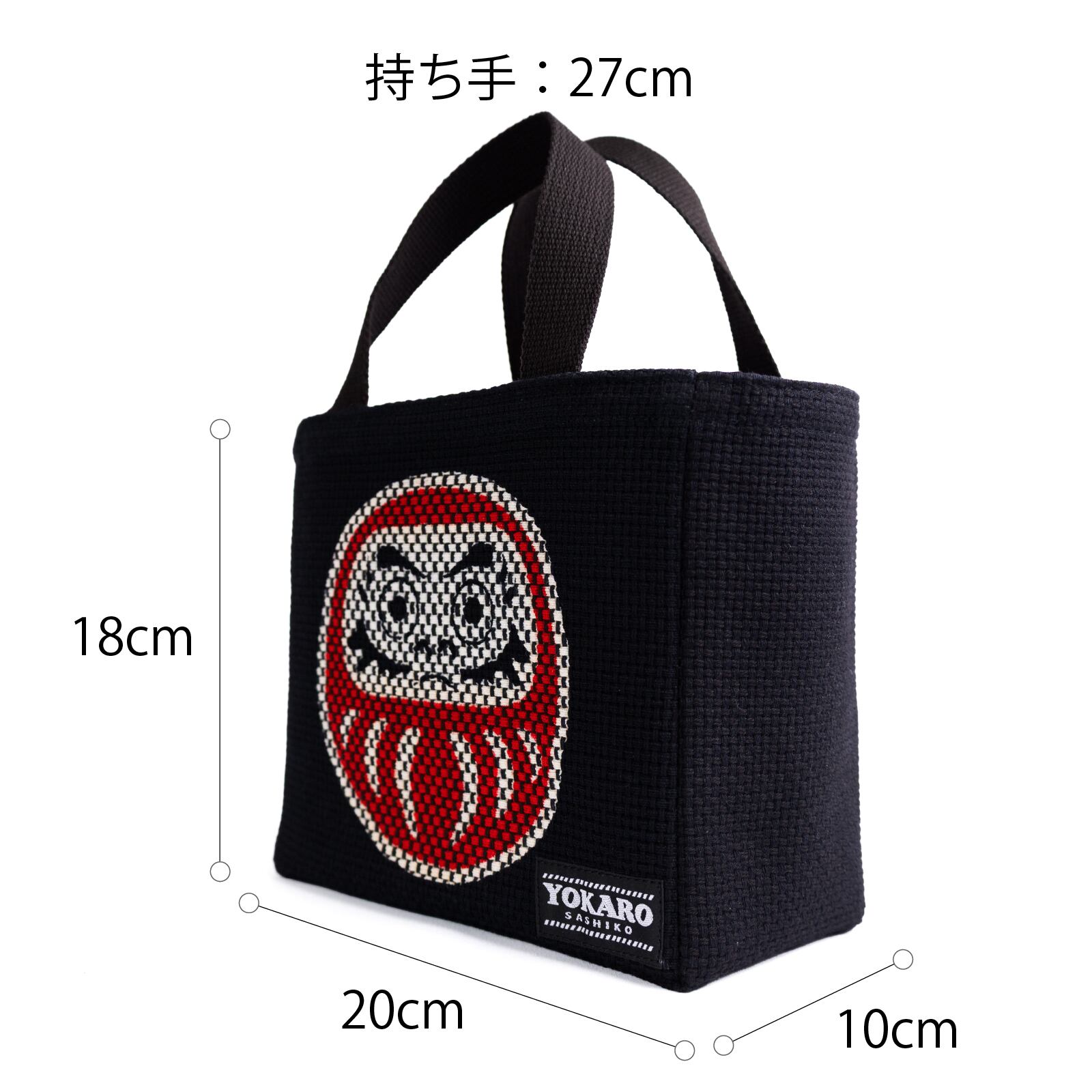 縁起の良い「だるま」をモチーフに刺子生地で丁寧に表現したトートバッグ。