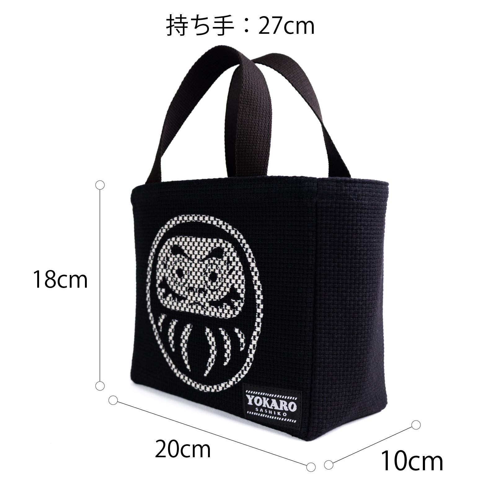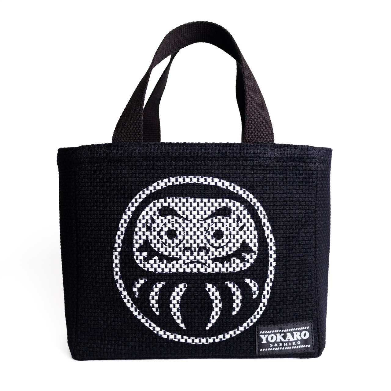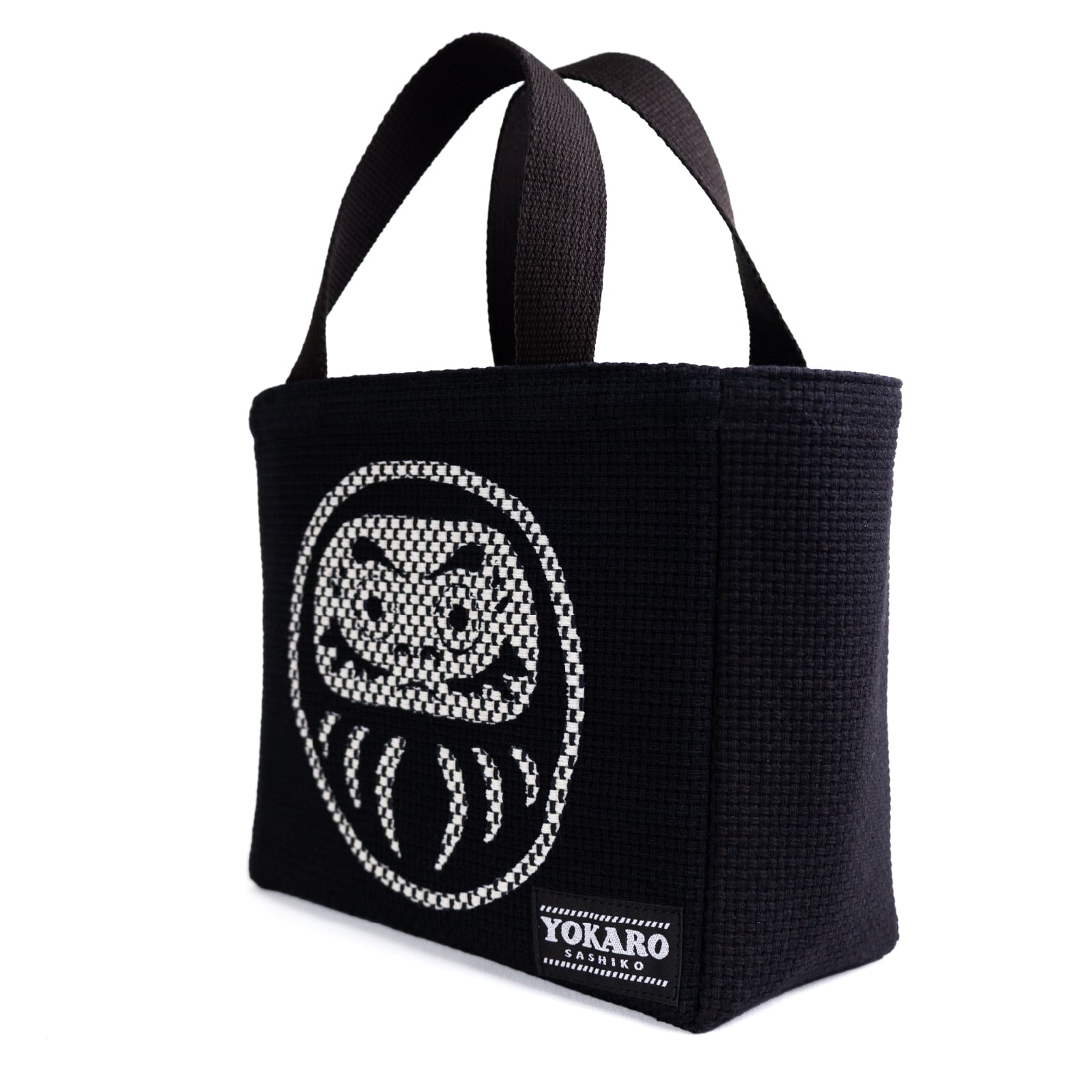 縁起の良い「だるま」をモチーフに刺子生地で丁寧に表現したトートバッグ。